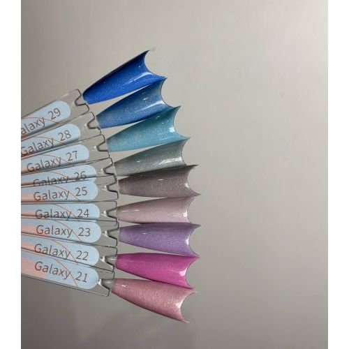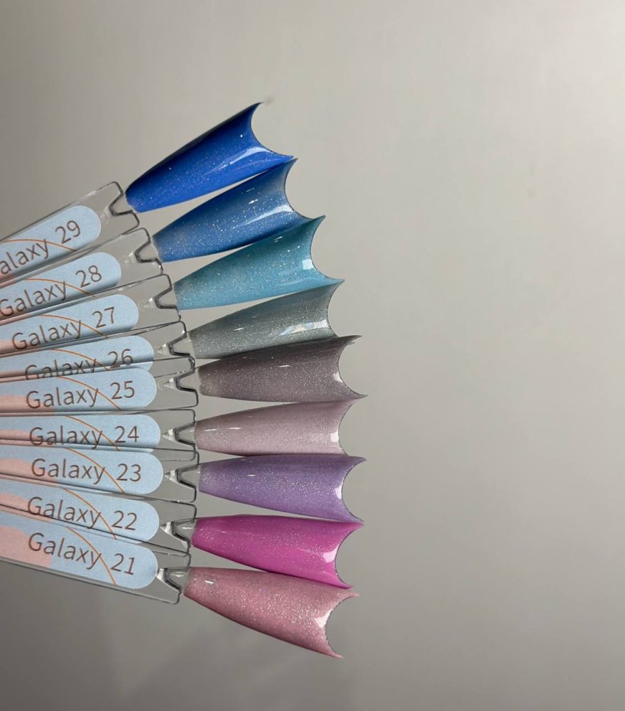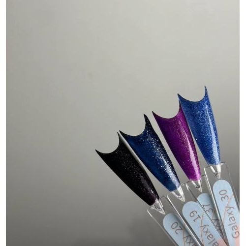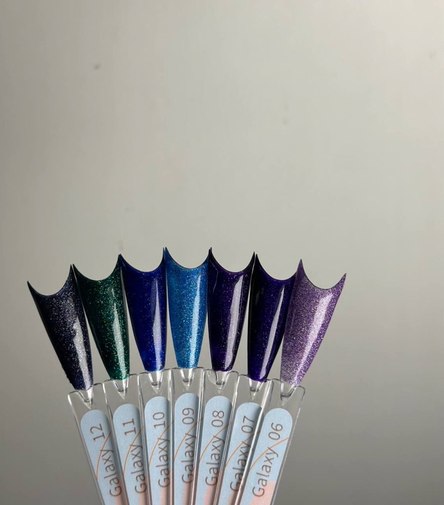 Гель-лаки GALAXY с глиттерами и блёстками — это продукты для маникюра, которые создают эффект сияния и переливов, напоминающий космическое пространство. Они содержат светоотражающие частицы, голографические элементы или мерцающие блёстки, что позволяет создавать яркие и эффектные дизайны