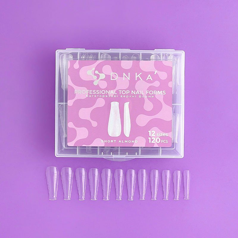 Верхние многоразовые формы для моделирования ногтей – это практичный и быстрый способ сэкономить время при работе, поскольку позволяют избежать финального опила при наращивании, до наращивании и реставрации. Имеют универсальную форму – балерина и подходят для наращивания миндаля, овала и короткого квадрата. DNKa Professional Top Nail Forms без труда снимаются после полимеризации благодаря жесткому и одновременно гибкому пластику. Идеальны в работе с DNKa' Acryl Gel, DNKa' Builder Gel и DNKa' Jelly Gel. Очень легкие и удобные в работе даже для начинающих.