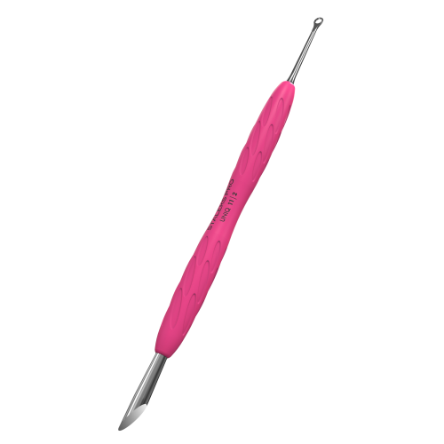 Силиконовая ручка с рельефными выемками равномерно распределяет давление и предотвращает скольжение инструмента в руке. Это снижает нагрузку на кисть, минимизирует дискомфорт даже при длительном использовании. Материал можно легко очистить и продезинфицировать, поэтому инструмент оптимален для использования в салонах.