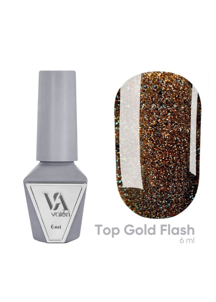 Valeri Top Gold Flash-это финишное покрытие без липкого слоя с декоративными элементами блестками разного цвета и размера, а также имеет золотые светоотражающие блестки , средней консистенции (ближе к густой), которое надежно защищает покрытие от царапин и других механических повреждений. Содержит в составе незначительные UV-фильтры, которые делают его универсальным, ведь можно использовать как на светлые, так и на темные оттенки покрытия. Легко самовыравнивается не затекает, не печет в лампе и обеспечивает надежную устойчивость покрытия.