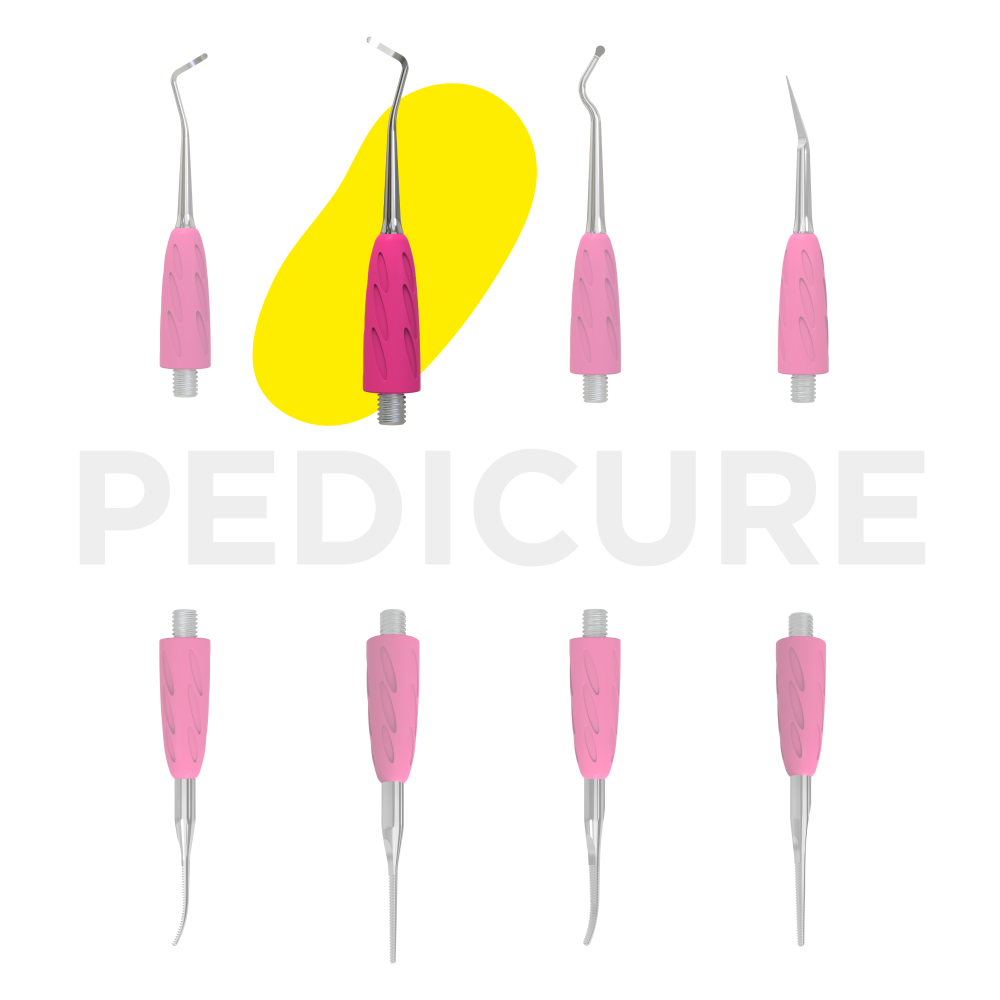 - «кюретка» с загибом вправо предназначена для частичного удаления сухих мозолей и работы с вросшим ногтем при выполнении педикюра;