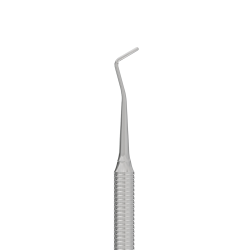 Поверхность кюретки отполирована до блеска. Инструмент полируют в два этапа: вначале на шлифовально-лепестковом круге с зернистостью, устраняя шероховатости, затем пастой ГОИ, добавляя глянец и защиту от коррозии.