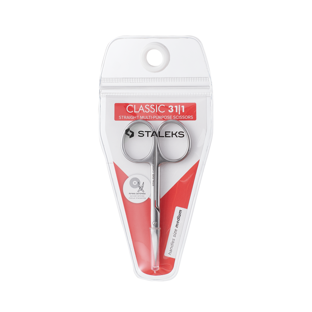 Ножницы универсальные STALEKS CLASSIC 31 TYPE 1 прямые подойдут как для обработки свободного края тонких и средних ногтей, так и для коррекции бровей в домашних условиях. Срезают ногтевую пластину точно и аккуратно, не оставляя неровностей, поскольку заточены вручную, с радиусным профилем. Инструмент изготовлен из медицинской стали и обработан пастой ГОИ для стойкости против коррозии.