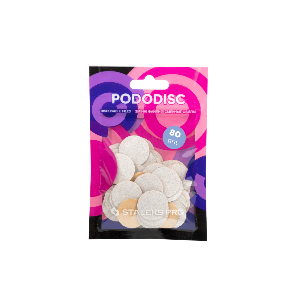 Staleks Pro PodoDisc M — самоклеющиеся накладки с абразивным полотном. Крепятся на педикюрный диск индивидуально для каждого клиента, а после работы — утилизируются. Нестандартное полотно с крупной насечкой предназначено для локальной проработки очень грубых наслоений омертвевшей кожи.