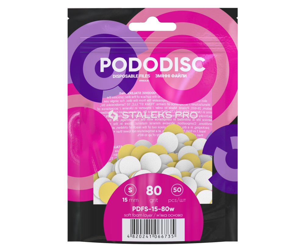 Самоклеющиеся одноразовые абразивы PODODISC S для диска-основы от Staleks Pro предназначены для быстрой и аккуратной чистки и шлифовки стопы. Наждак c тонкой пенной основой, нанесенный на подо-диск в считанные минуты избавит от ороговевших клеток и мозолей. После использования наклейка с абразивом снимается с поверхности диска которая тут же отправляется на стерилизацию. Для каждого клиента мастер использует новый абразив.