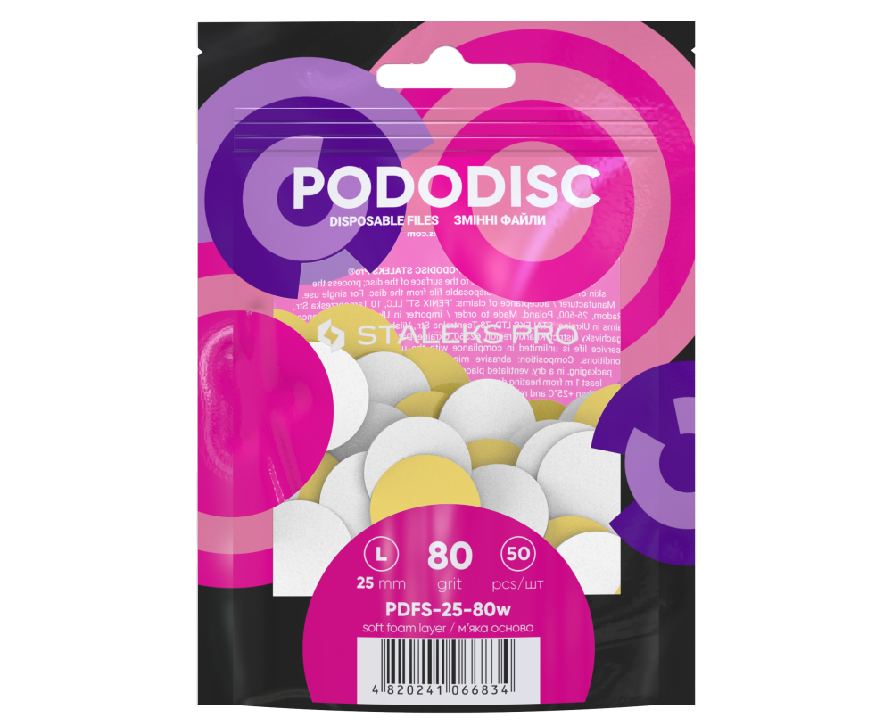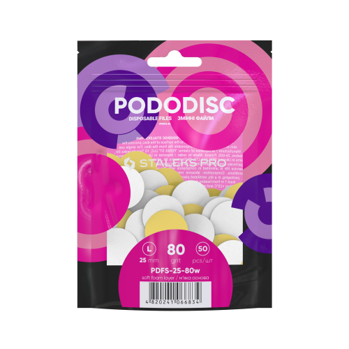 Pododisc Staleks Pro 80 грит — сменные наклейки с абразивом 80 грит, которые позволяют педикюрному диску одновременно обработать обширную площадь огрубевшей кожи. Жесткая гритность предназначена для снятия значительной толщины роговых наслоений. Накладки надежно крепятся и легко снимаются, не размокают в воде и обеспечивают качественное, равномерное очищение от ороговевшего эпидермиса.