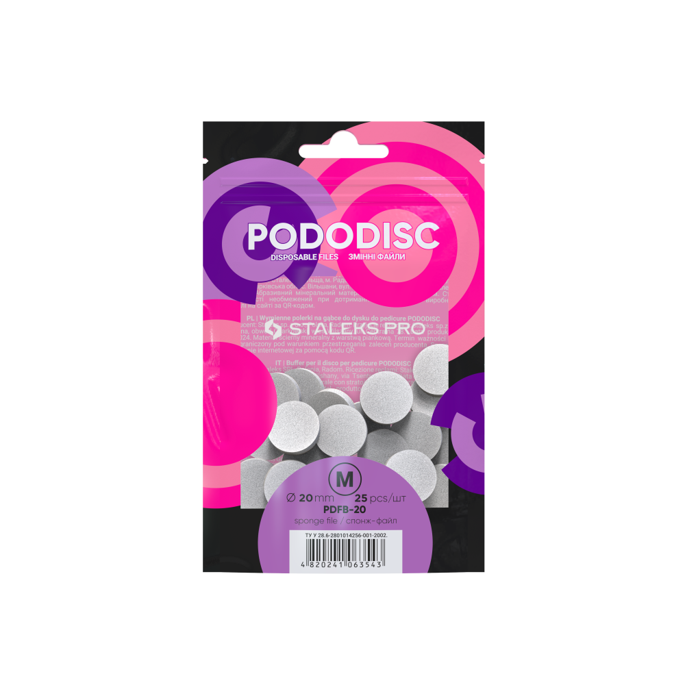 Самоклеящиеся одноразовые спонж-файлы для педикюрного диска PODODISC от Staleks Pro предназначены для аккуратной, быстрой и качественной обработки стоп. Абразив c толстой пенной основой, нанесенный на подо-диск идеально полирует поверхность ног и шлифует мелкие трещины, что сохраняет эффект гладких стоп намного дольше обычного. После использования спонж-файл снимается с поверхности диска, который тут же поддается стерилизации. Для каждого клиента мастер использует новый сменный файл.