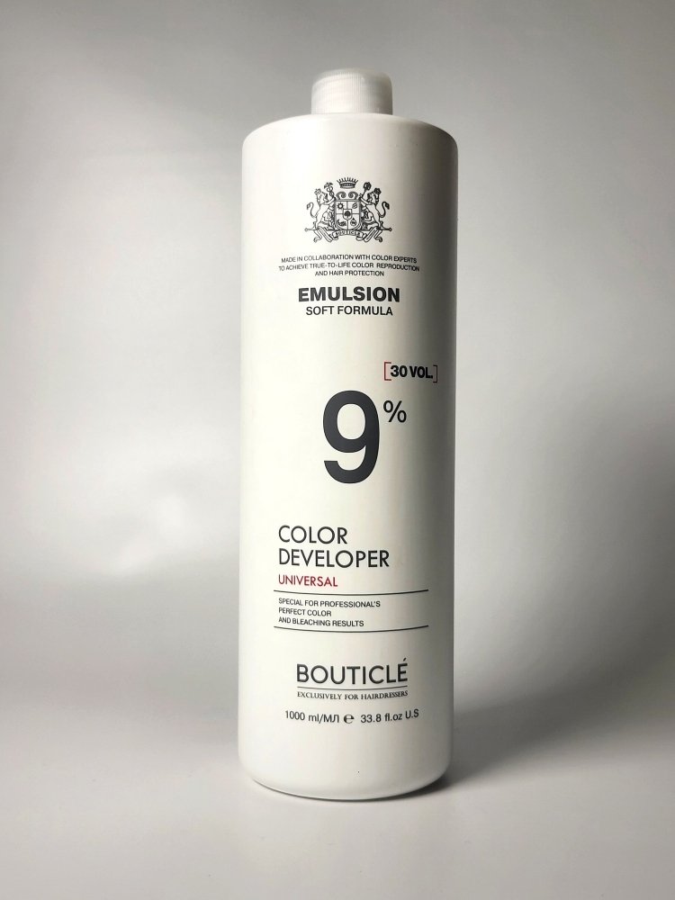 Оксидант-лосьон 9% (30 vol.). Мягкая формула окисляющей эмульсии обладает защитным и смягчающим действием, деликатно ухаживая за кожей головы и волосами в процессе окрашивания, осветления и обесцвечивания. Предназначена для использования с профессиональными красителями и обесцвечивающими средствами бренда BOUTICLÉ в соответствии с инструкцией по применению. Оказывает увлажняющий эффект.